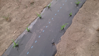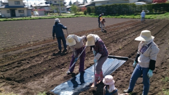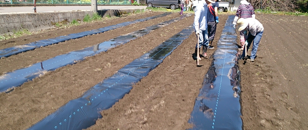 その後、メンバー全員で畝作りをし、ハカセオススメの肥料「ゆうきりんりん」を撒いて下地を整えます。その上にマルチを敷きました。