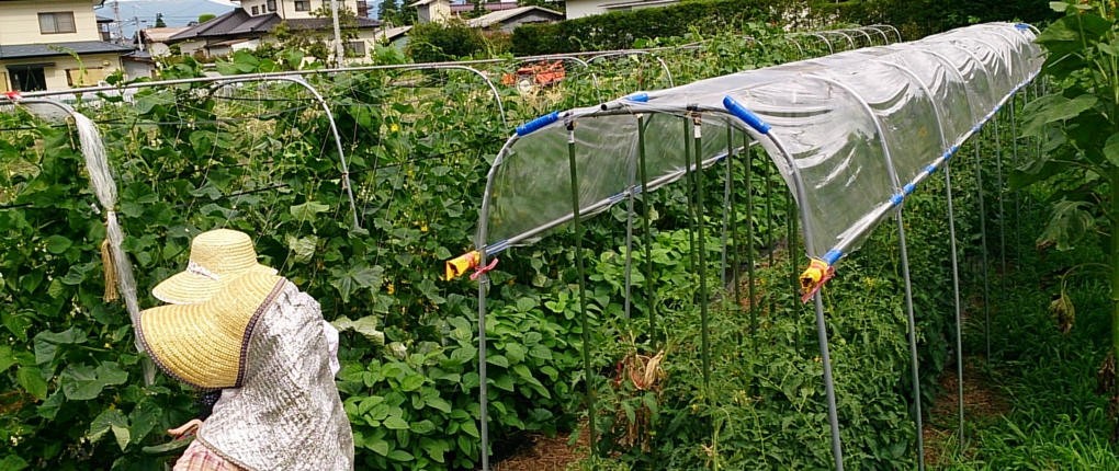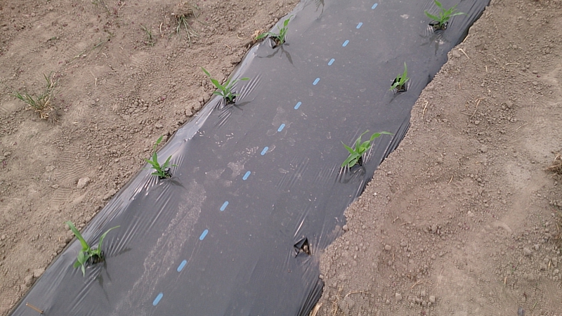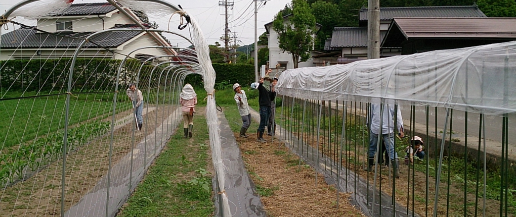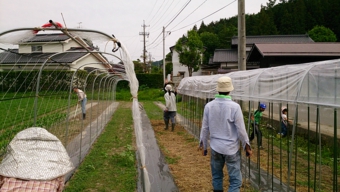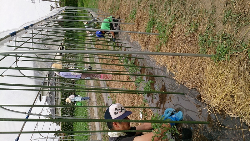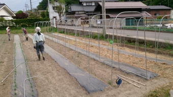 トマトは雨を嫌うので畝を覆うように、きゅうりは畝と畝の間にたてていきます。