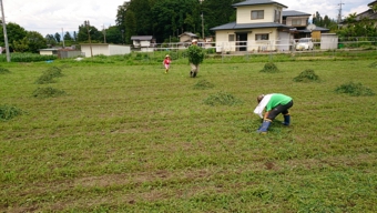 除草は畝の周りの草を刈り、また生えてこないように刈った草を敷き詰めていきます。事前にハカセが畑以外の部分の草を刈ってまとめてくれていたので、それを敷き詰めていきました。