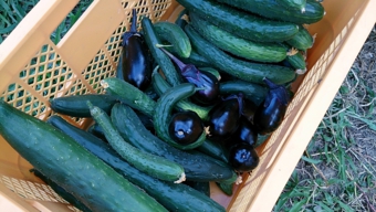 おばけキュウリとナス、万願寺唐辛子を収穫しました。