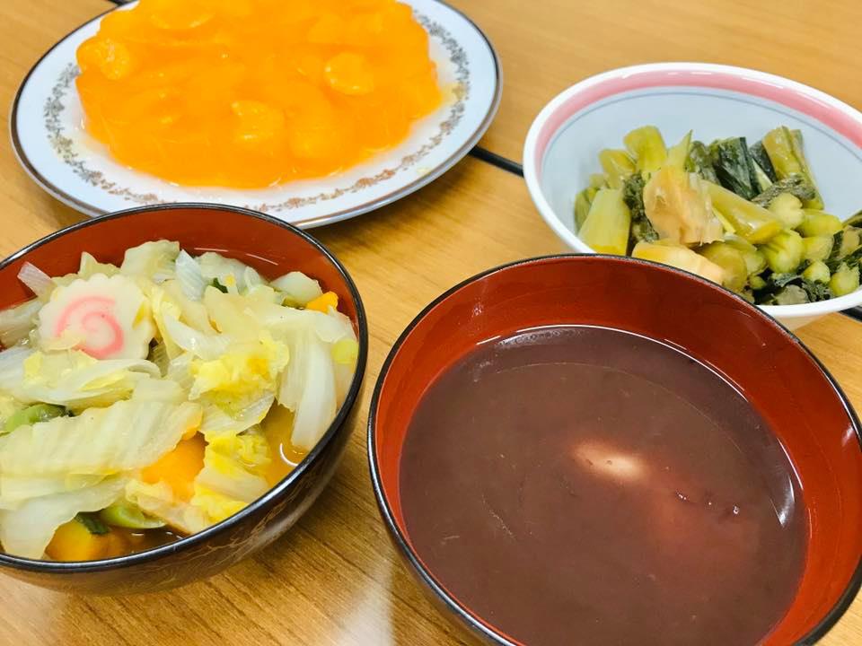野菜たっぷりのお雑煮、つぶあんがアクセントのおしるこ、みかんゼリーに野沢菜漬、お茶。