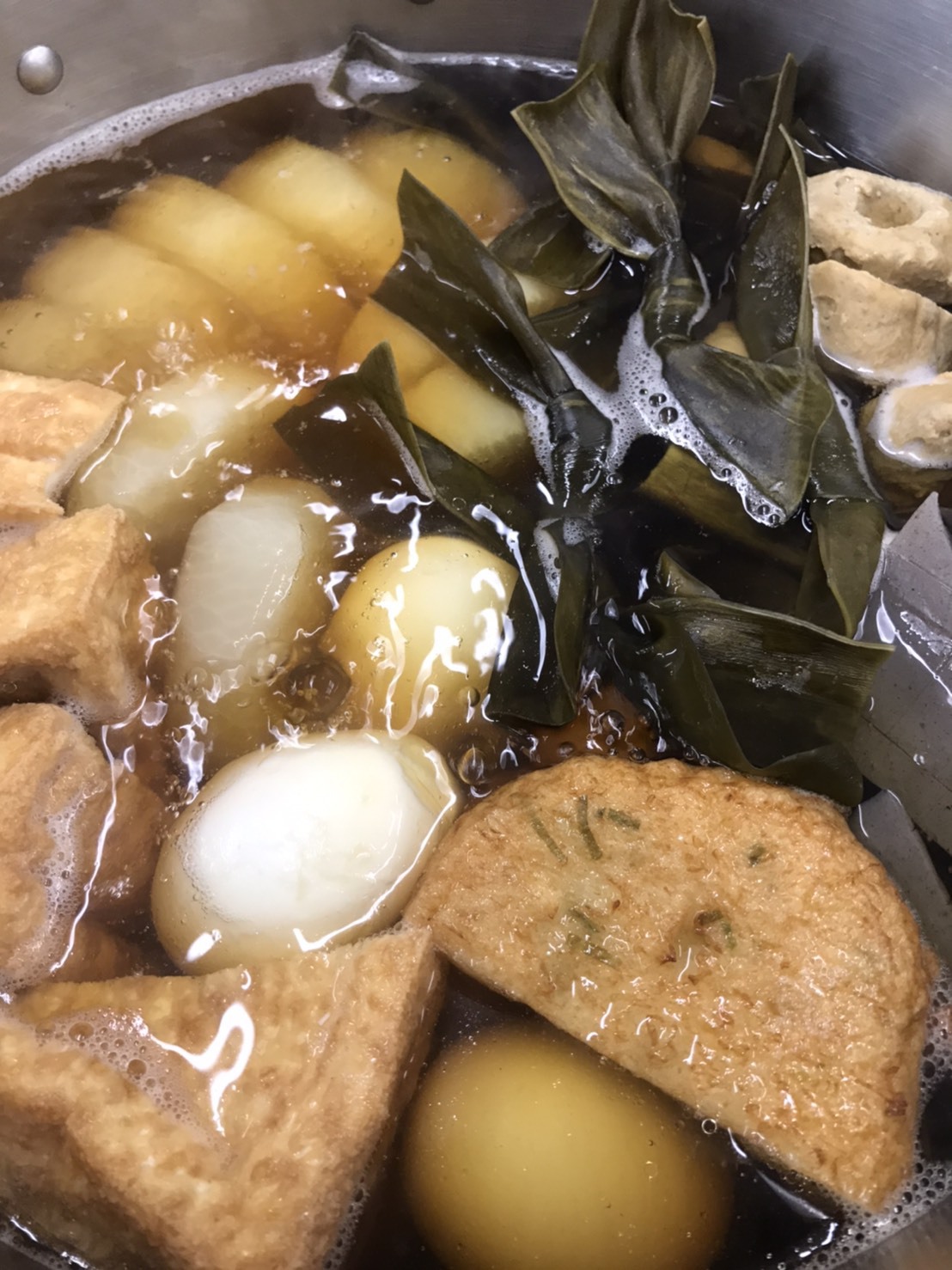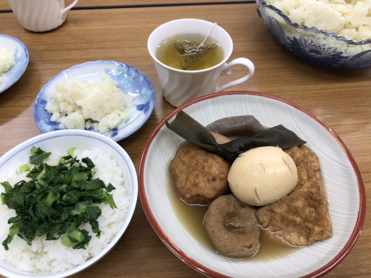 11月のメニューは、おでん、きざみ大根葉のごはん、マッシュポテト、バラのアップルパイ。
