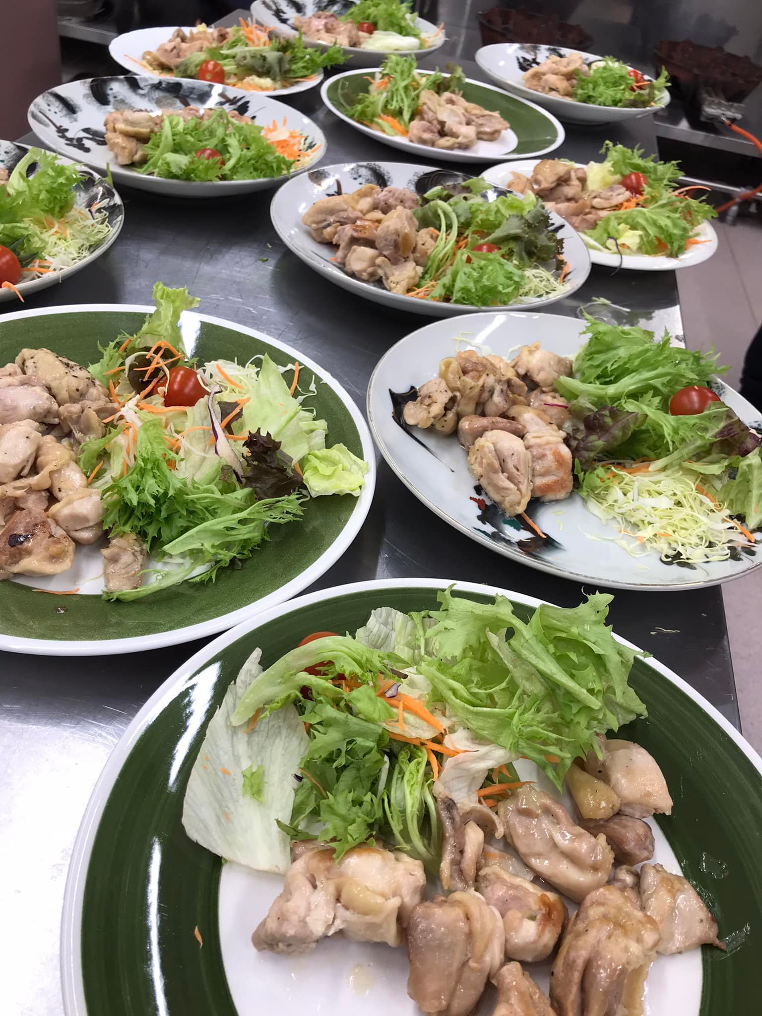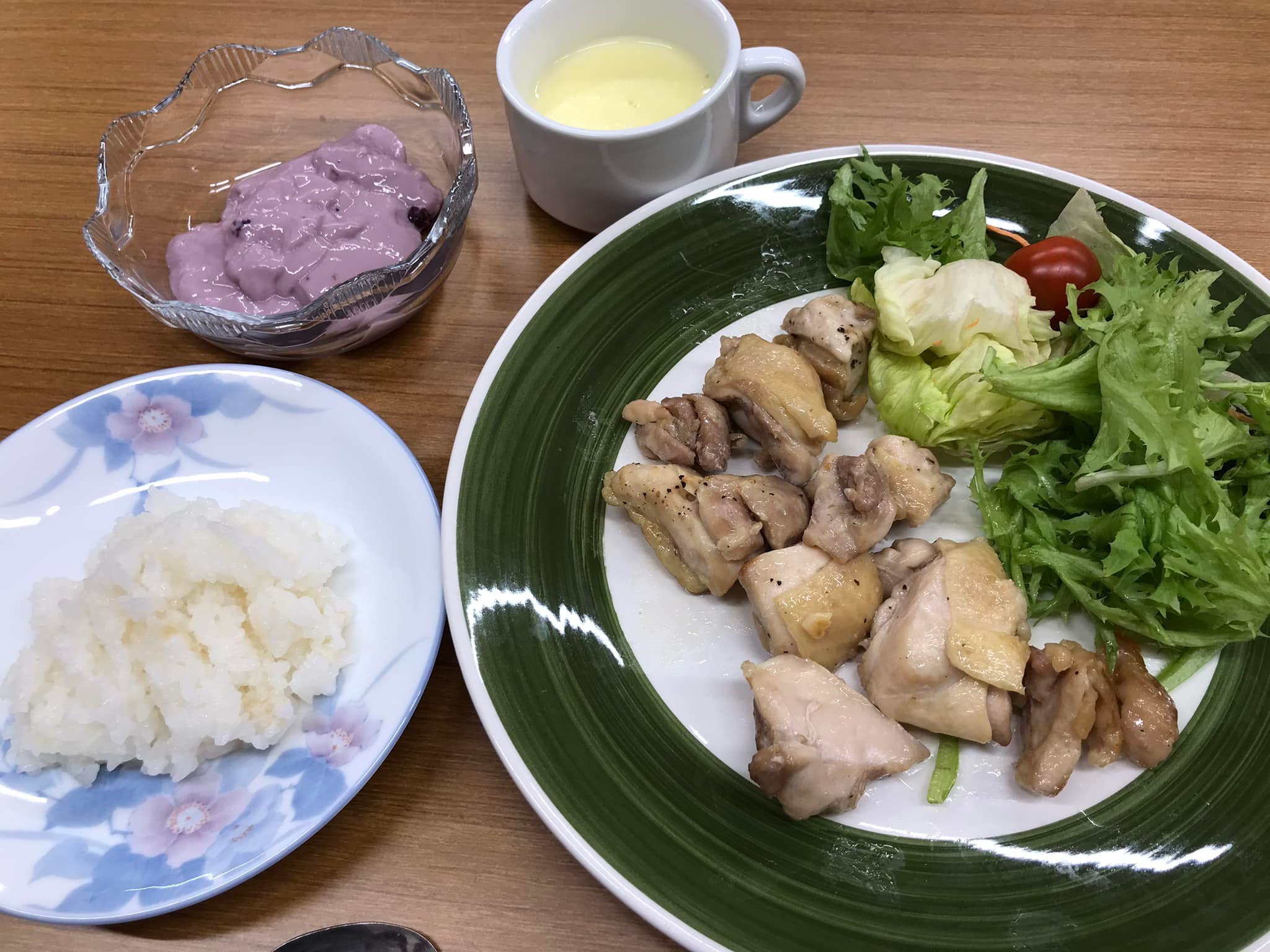 メニューは、クリスマスにちなんで、チキンのハーブソテー、サラダ、コーンスープ、ガーリックライス、デザート。